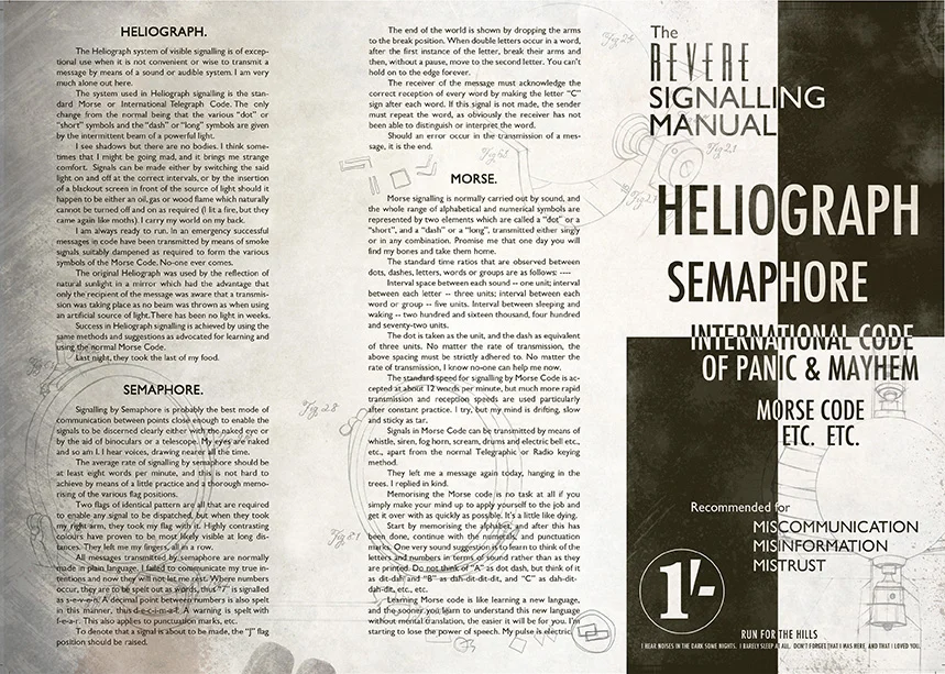 Special, limited edition packaging designed, illustrated and produced (by hand, by me…) for rock band Revere, to mimic a WW2 heliograph (signalling device). Incorporates original illustrations, military symbol languages, and found imagery to create an absorbing, unsettling piece of collectible art (with good music!). Includes a transcription of a spoken word track using International maritime signal flags...